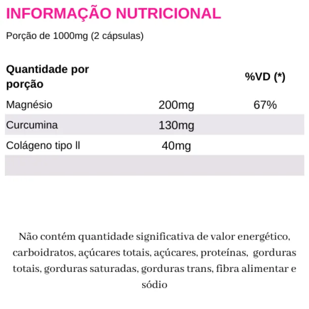 Magnésio dimalato, extrato de rizomas de Cúrcuma longa, colágeno tipo II, antiumectante dióxido de silício.