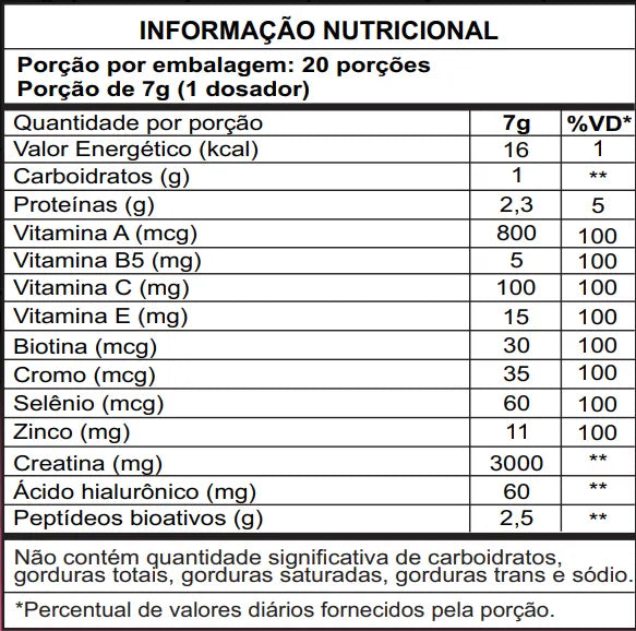 Creatina monohidratada, peptídeos bioativos de colágeno hidrolisado com peso molecular médio 2 kDa (Verisol®), hialuronato de sódio obtido pela fermentação de Streptococcus zoopidemicus, óxido de zinco, selenometionina, ácido pantotênico, acetato de retinol, ácido ascórbico (Vitamina C), DL-alfa-tocoferol (Vitamina E), picolinato de cromo, D-biotina, aromas idênticos aos naturais de morango e limão, edulcorante sucralose e antiumectante dióxido de silício.